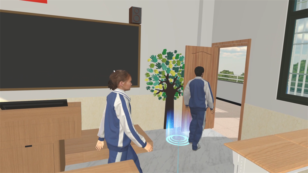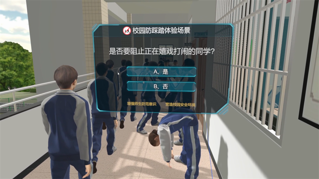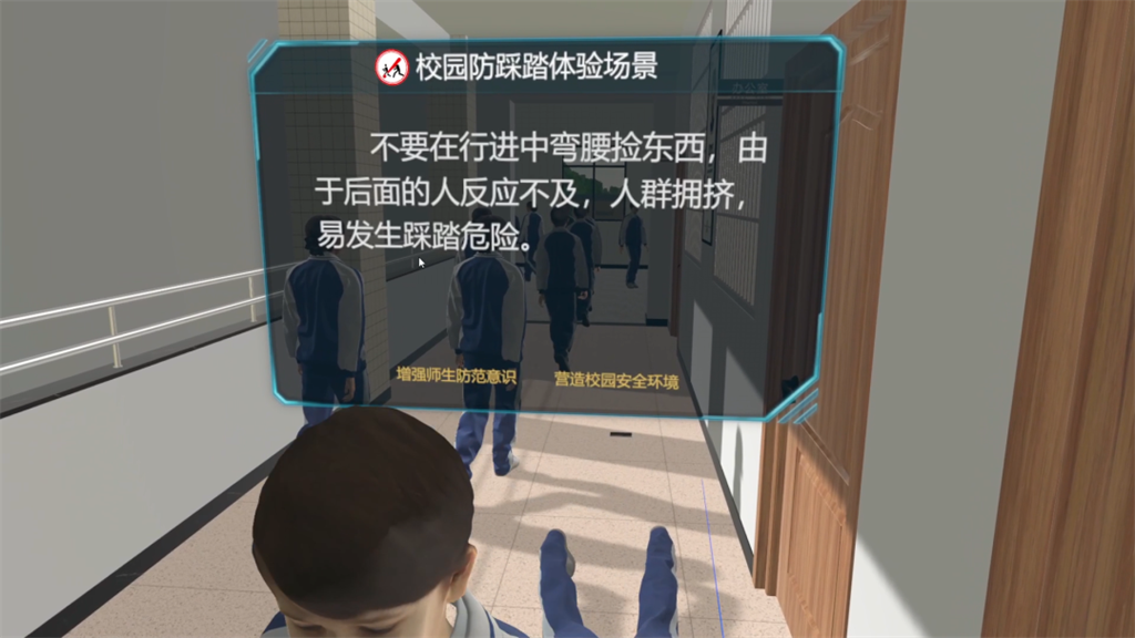 校園VR防踩踏體驗(yàn)場(chǎng)景軟件從學(xué)校日常的早操入手,更具真實(shí)感與代入感;在校園早操準(zhǔn)備過(guò)程中,學(xué)生們需集體前往操場(chǎng),期間有同學(xué)在彎腰系帶、樓道走廊內(nèi)亂竄打鬧、人群擁擠處彎腰下蹲撿東西、在人流處逆向跑步、在下樓樓梯時(shí)互相推操擁擠、在下樓樓梯發(fā)生意外跌倒后,后面未知的人群依然涌動(dòng)前行的狀況。