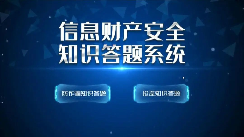 設(shè)備待機(jī)畫面為“信息則產(chǎn)安全知識(shí)答題系統(tǒng)”動(dòng)態(tài)演繹,下面分為防詐騙知識(shí)答題模塊和搶盜知識(shí)答題模塊。