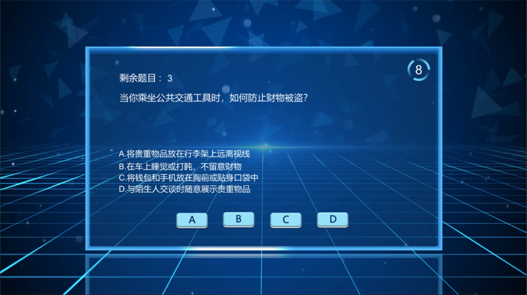 針對(duì)搶盜風(fēng)險(xiǎn),系統(tǒng)以互動(dòng)答題的形式模擬日常生活中可能遇到的搶劫、盜竊等突發(fā)情況。例如,在公共場(chǎng)所的休息區(qū),如何防止財(cái)物被盜,或在公共場(chǎng)所財(cái)物被盜等場(chǎng)景。用戶需要在模擬情境中選擇正確的應(yīng)對(duì)措施,系統(tǒng)會(huì)根據(jù)用戶的選擇提供實(shí)時(shí)反饋,幫助用戶學(xué)習(xí)如何冷靜應(yīng)對(duì),采取正確的自我保護(hù)措施。