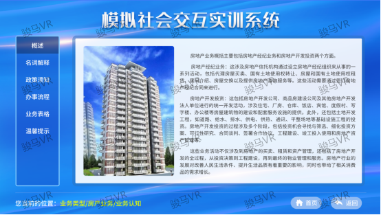 模擬社會(huì)交互實(shí)訓(xùn)系統(tǒng)具備6種模擬業(yè)務(wù)辦理知識(shí),涵蓋民政、房產(chǎn)、公證、工商、司法所及派出所等關(guān)鍵社會(huì)服務(wù)領(lǐng)域,每個(gè)模塊均細(xì)分為5個(gè)子部分,分別是繪聲繪影、業(yè)務(wù)認(rèn)知、法律講堂、隨堂測(cè)驗(yàn)、聯(lián)系直通車,旨在通過(guò)多角度、多層次的交互體驗(yàn),深化服刑人員對(duì)每一個(gè)業(yè)務(wù)流程的理解和掌握。