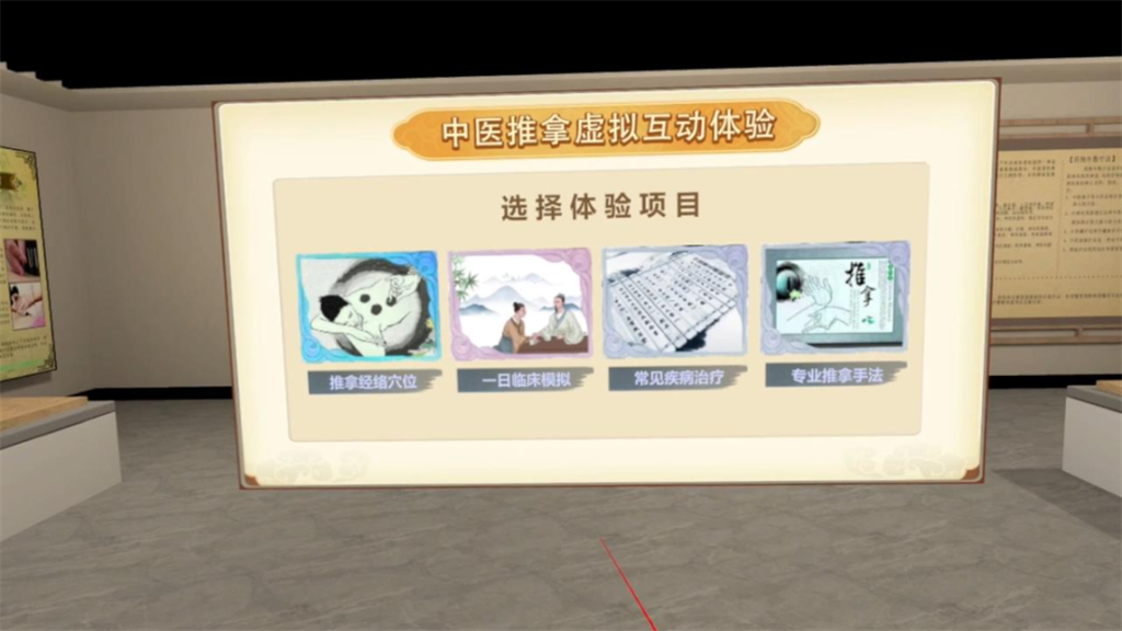 系統(tǒng)通過模擬真實的推拿環(huán)境,讓體驗者在仿真場景中學(xué)習(xí)推拿的多種手法,包括但推、揉、捏等技巧,除此之外還有數(shù)種病例體驗場景,讓體驗者進行模擬操作。